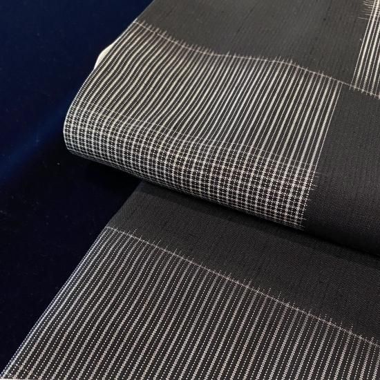 白糸は格子から縞に織りわけ、濃さに変化を持たせることで立体的に魅せてます。
