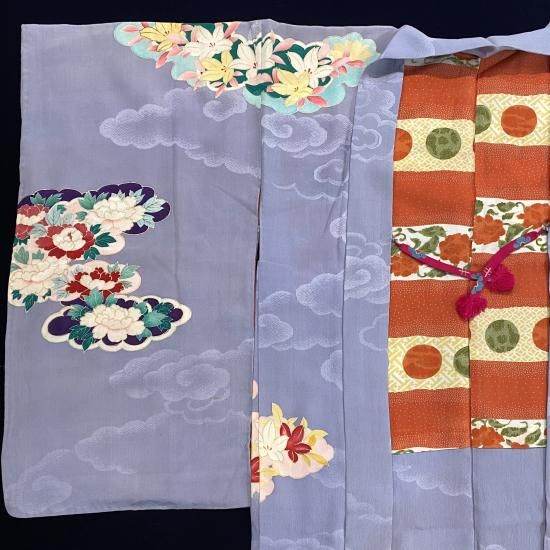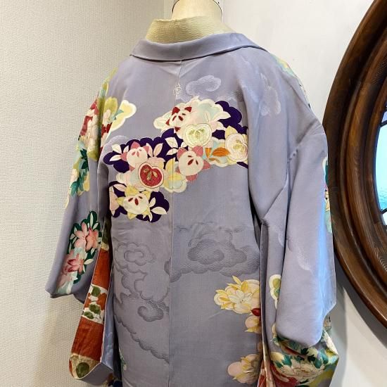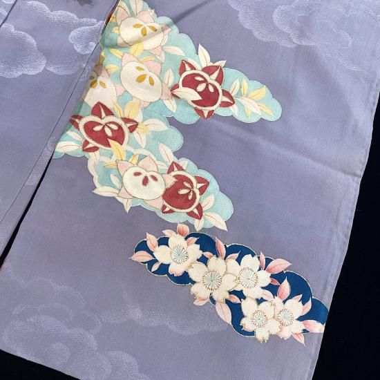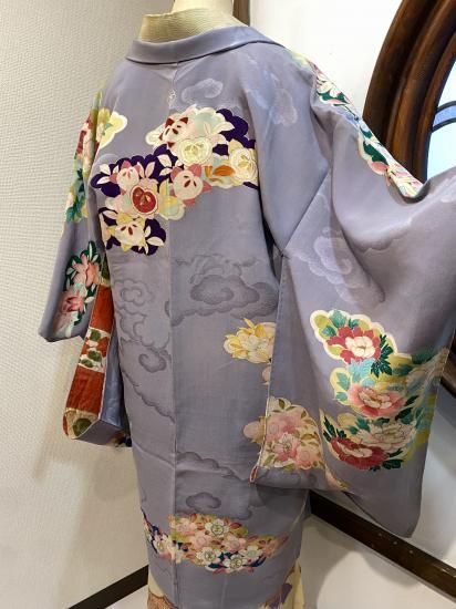 浮き上がる地紋に合わせた雲文に鮮やかな花を乗せた絵羽織です。