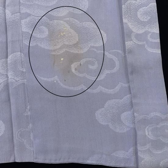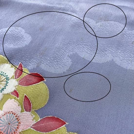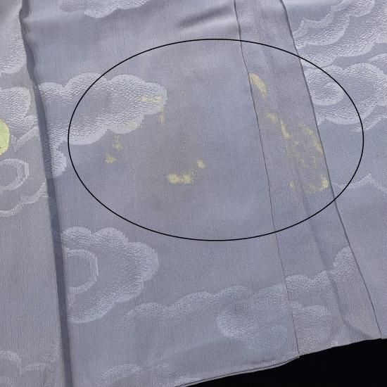 色ムラ・点ジミが多数あります。両前身頃下部に柄を足し、シミを目立たなくする加工を施してあります。(画像参照)
