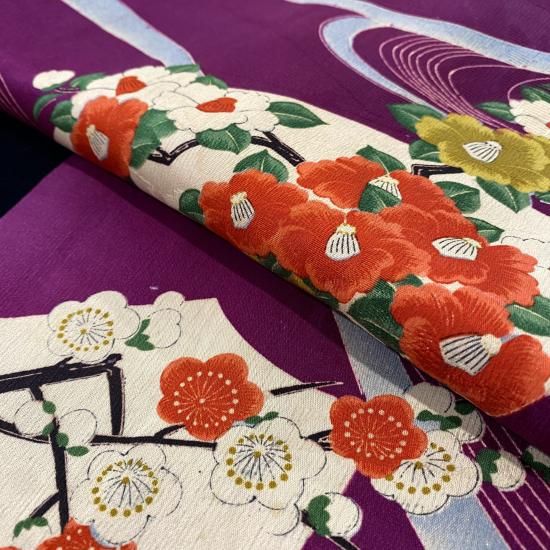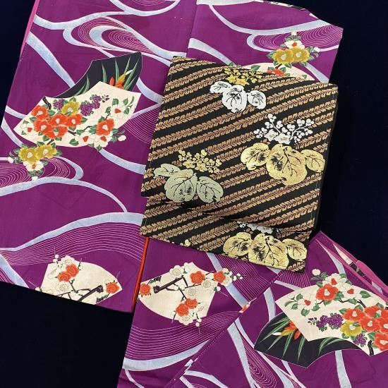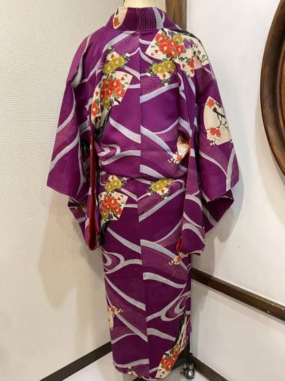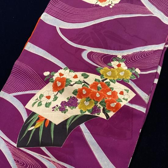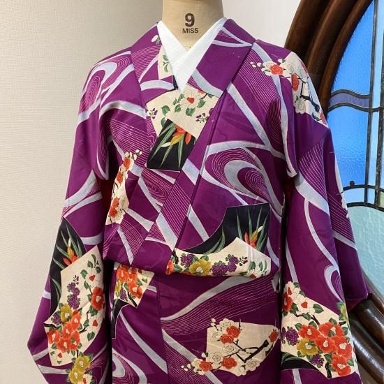 アンティークらしい紫に黒がピリリと効いた、幅広い世代でお召しいただけそうな小紋です。