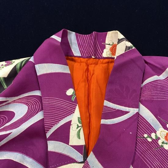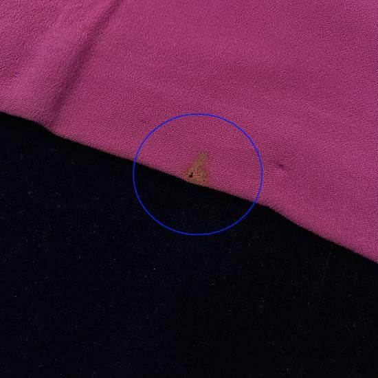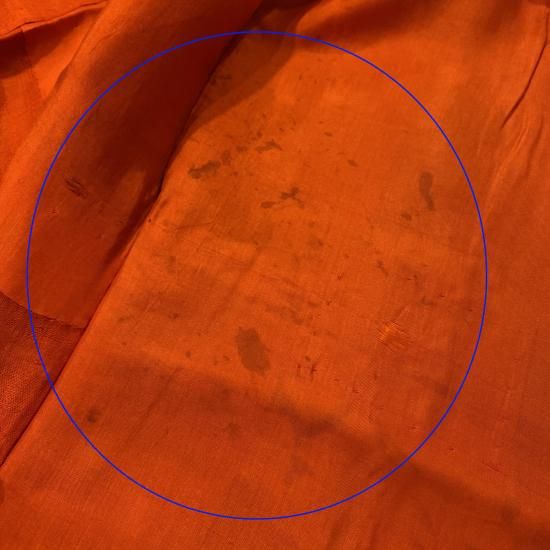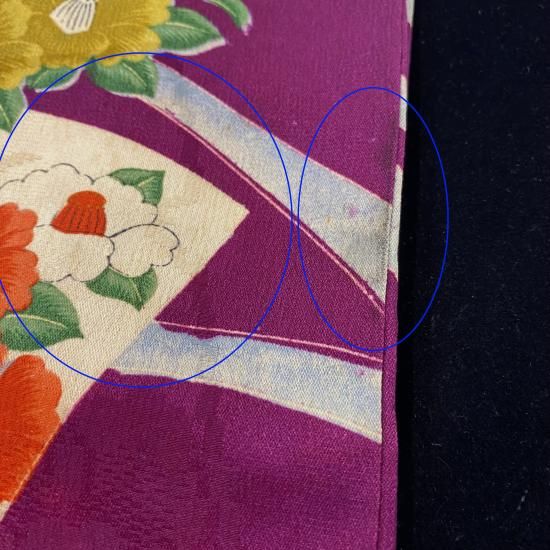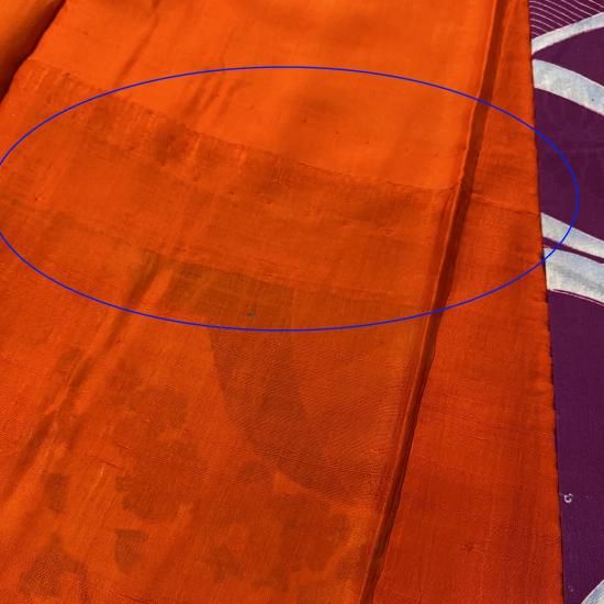 衿山に薄ジミ、胴裏・八掛に接ぎ合わせ・小穴・補修跡・シミ、他薄アク、薄ジミ、分かりづらいピンホールがあります。(一部画像参照)